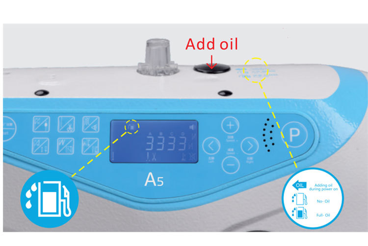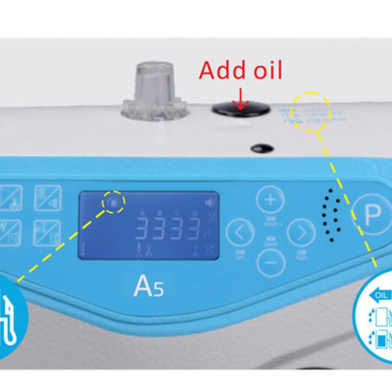 Được trang bị với hộp dầu kín , máy thực hiện bơm dầu về các bộ phận linh kiện bên trong máy tránh được bụi bẩn bám vào thiết bị. Thanh trụ kim chắc chắn loại cabonade với độ bền được cải thiện. Chỉ với 1 ít mỡ rắn bôi ở đầu máy, A5 giúp cho máy hoạt động trong tình trạng dầu khô mà vẫn đảm bảo máy được bôi trơn hoàn hảo. Hạn chế được tình trạng máy bị ra dầu ở trụ kim, làm rớt dầu xuống mặt vải, và làm bẩn sản phẩm. Bằng công nghệ này, A5 giúp tiết kiệm chi phí sử dụng dầu tẩy bẩn, tiết kiệm thời gian, đem đến đến 1 sản phẩm sạch sẽ nhất mà không mất nhiều công sức.