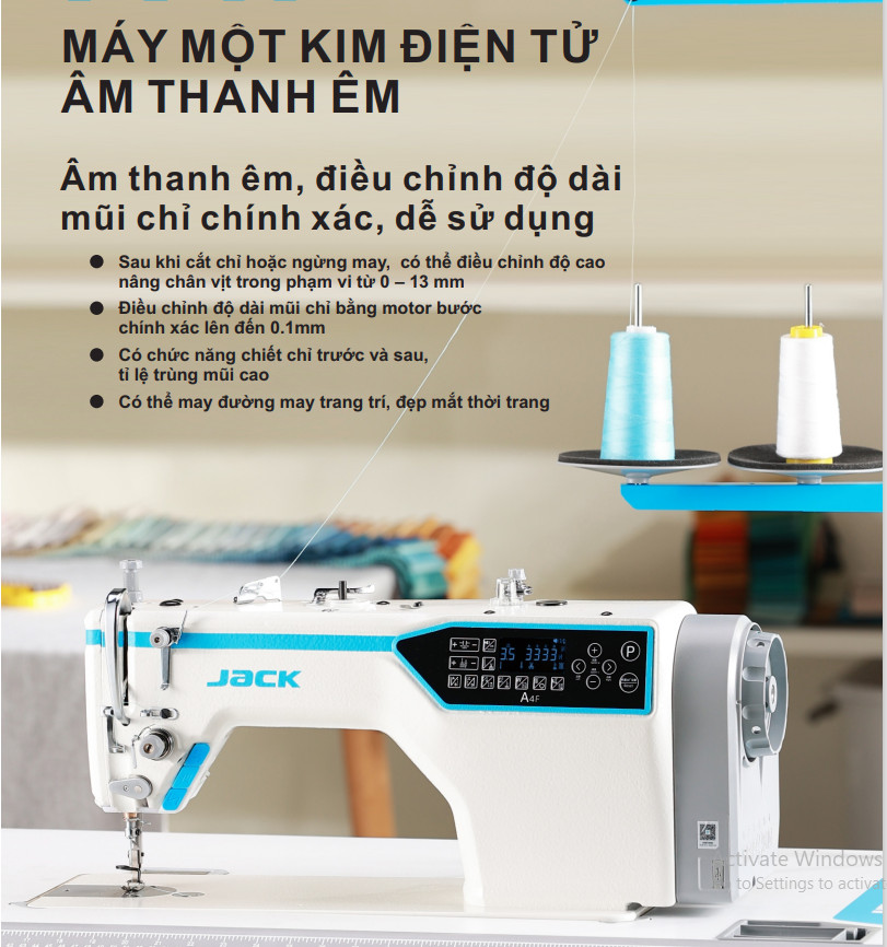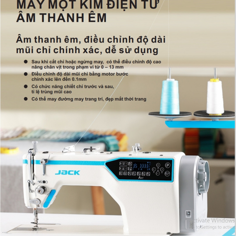 Máy may điện tử Jack A4F với nhiều tính năng vượt trội, tốc độ cao, cắt chỉ tự động, lại mũi tự động,hệ thống nâng chân vịt tự động, máy có chức năng giọng nói bằng Tiếng Việt, Tiếng Anh, đường chỉ đẹp, sắc nét phù hợp cho tất cả các loại vải may như: thun, kaki, somi, voan, jean,…